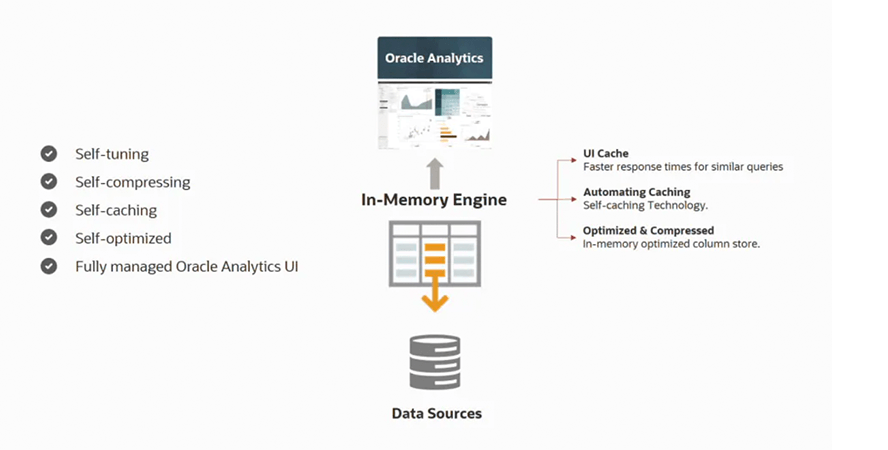 This image shows Oracle Analytics, which contains an in-memory engine that boosts the performance of slow, or legacy data sources. On the left, are built-in capabilities describing the in-memory engine.