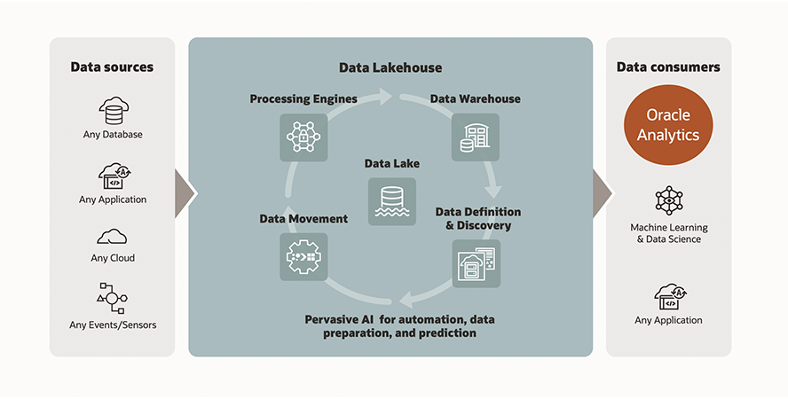 The central box depicts the Oracle data lakehouse and the services that comprise it. However, in context of Oracle Analytics, the data lakehouse can be comprised of services from any cloud vendor. The services shown in the diagram are the data warehouse, data definition and discovery, data movement, and data processing engines. Information from the central box then flows to the right-hand box. The right-hand box shows the data consumers, including Oracle Analytics, machine learning, and data science or any other application.