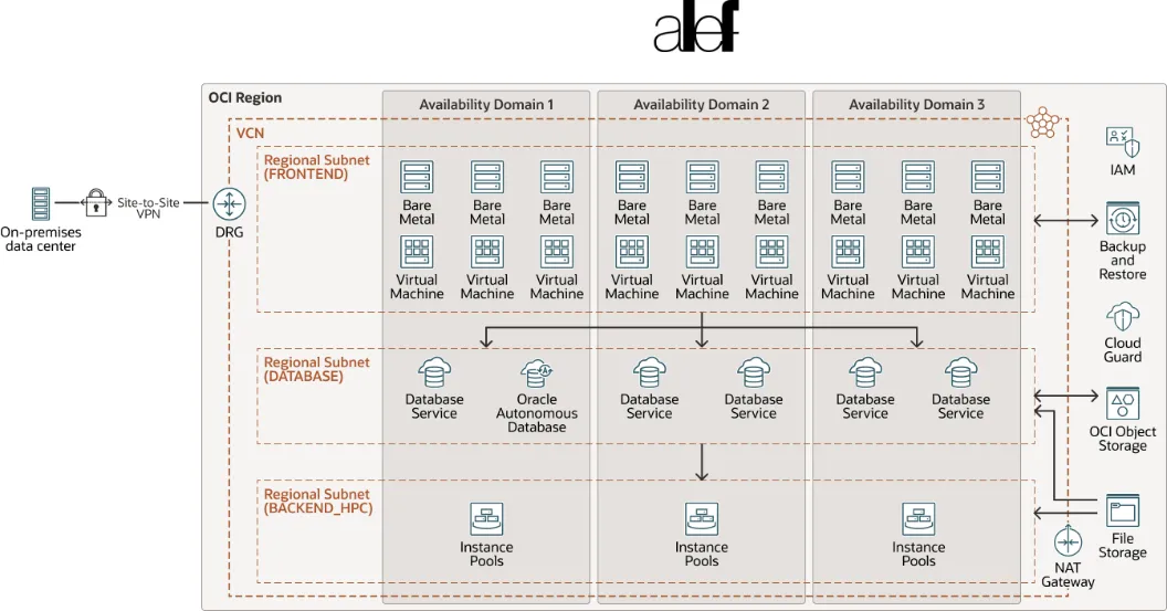OCI includes all the services needed to migrate, build, and run IT in the cloud, from existing enterprise workloads to new cloud native applications and data platforms. ALEF used the following OCI services and technologies: