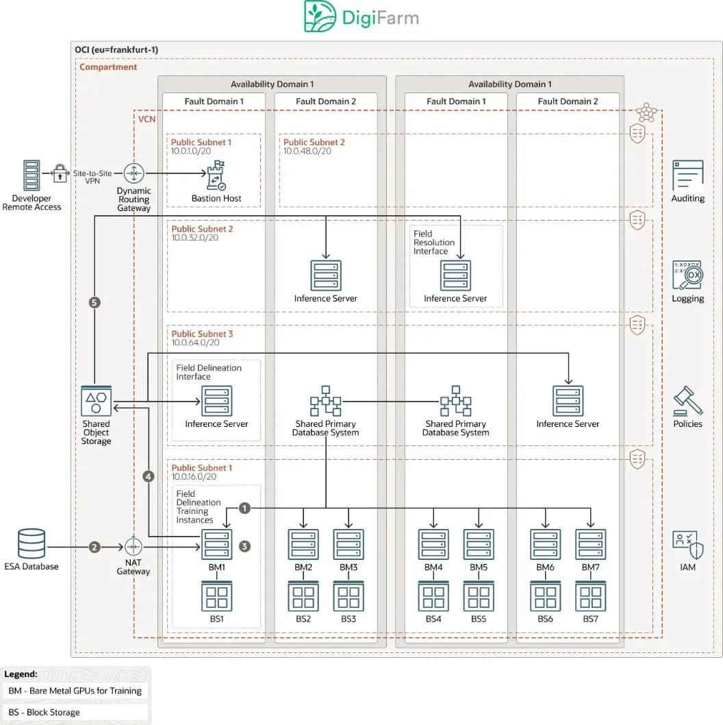 OCI includes all the services needed to migrate, build, and run IT in the cloud, from existing enterprise workloads to new cloud native applications and data platforms. DigiFarm used the following OCI services and technologies: