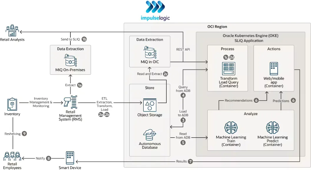SLiQ's microservices are used for data transformation, web and mobile applications, user services, store services, product services, and more. The machine learning (ML) capabilities for training and prediction are developed in Python. After receiving the data sets that are extracted by MiQ, SLiQ loads this data into Oracle Autonomous Transaction Processing for ML analysis. The ML capability trains the model, predicts inventory events, and then sends recommendations back to the retail employees to access the results through mobile devices. The retail employees are provided with actionable insights, such as which shelves to stock and when to restock them, minimizing the time products sit in the stockroom or warehouse.