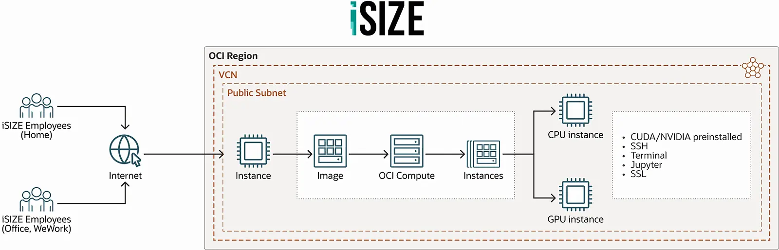Then bare metal instances were started with the latest NVIDIA A10 GPU available. The instances consist of a mixture of container and custom instances. The platform is accessible on secured public web browser over SSL or directly by SSH with secure authentication. Oracle’s availability allows iSIZE to run continuously.