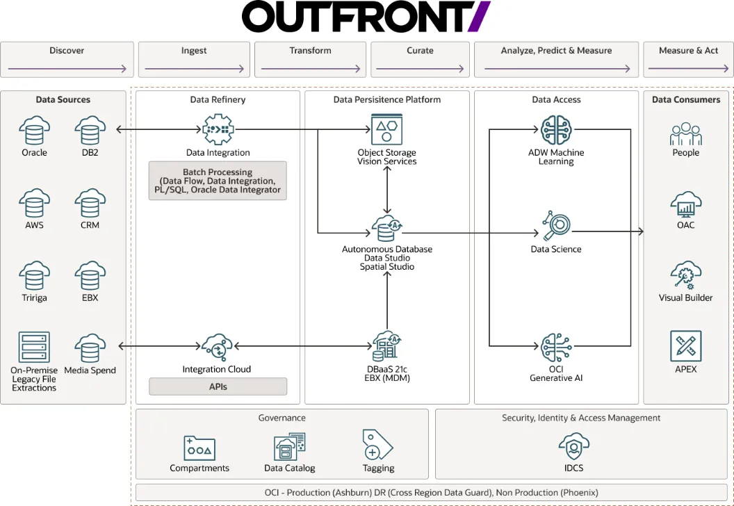 Oracle Cloud Infrastructure (OCI) includes all the services needed to migrate, build, and run IT in the cloud, from existing enterprise workloads to new cloud native applications and data platforms. OUTFRONT Media used the following OCI services and technologies: