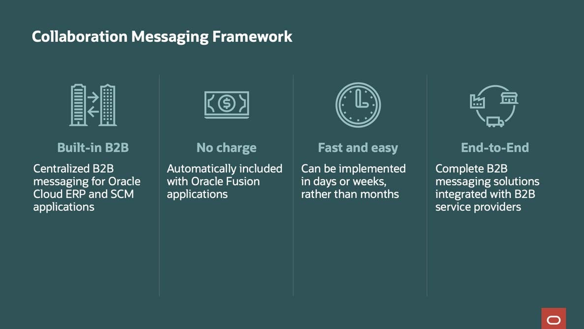 Collaboration Messaging Framework 是 SCM 和 ERP 客户可以免费使用的一个 Fusion 应用。该应用主要处理入站和出站 B2B 消息,从而自动执行采购、订单管理、发运/接收、开票、计划以及其他需要贸易伙伴通信的流程。