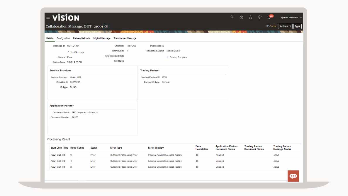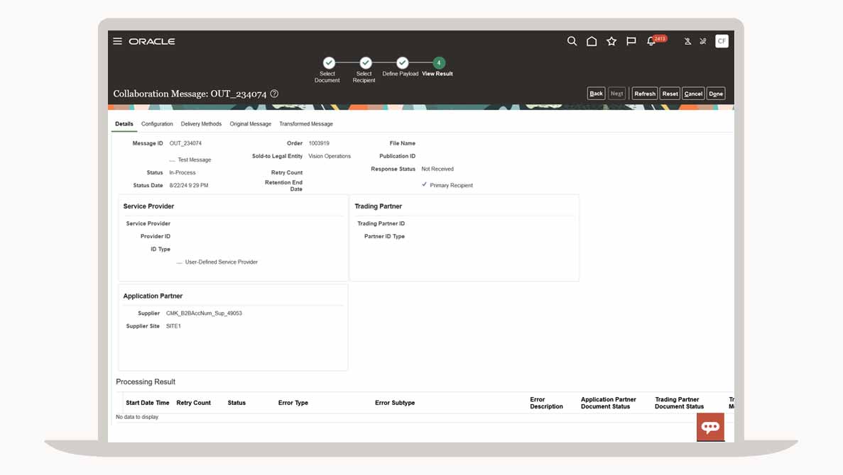 如果 B2B 消息出现问题,应用将提供有关消息配置、处理、有效负载和报错的完整详细信息。您可以编辑和重新处理消息以解决报错,如果已多次处理,还可以查看消息的完整历史记录。