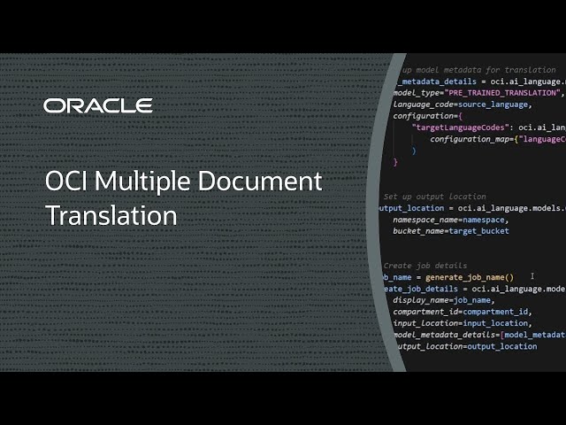 Mit dieser Lösung können Sie die Übersetzung mehrerer Dokumente automatisieren, die in einem Oracle Cloud Infrastructure-(OCI-)Objektspeicher-Bucket gespeichert sind. Stellen Sie sich zum Beispiel ein Unternehmen vor, das an einem Open-Source-Projekt mit Mitwirkenden auf der ganzen Welt zusammenarbeitet. Mit dieser Lösung können Dokumentation und Anweisungen in mehrere Sprachen übersetzt werden, sodass Entwickler weltweit nahtlos beitragen können.