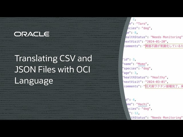In dieser Lösung verwenden wir Oracle Cloud Infrastructure (OCI) Language, um die Übersetzung bestimmter Spalten in CSV-Dateien oder Schlüsseln in CSV- und JSON-Dokumenten zu ermöglichen und dabei die ursprüngliche Struktur der Dateien beizubehalten. Dieser Anwendungsfall ist besonders nützlich, um Datendateien zu lokalisieren und dabei das Format und die nicht übersetzten Felder beizubehalten.