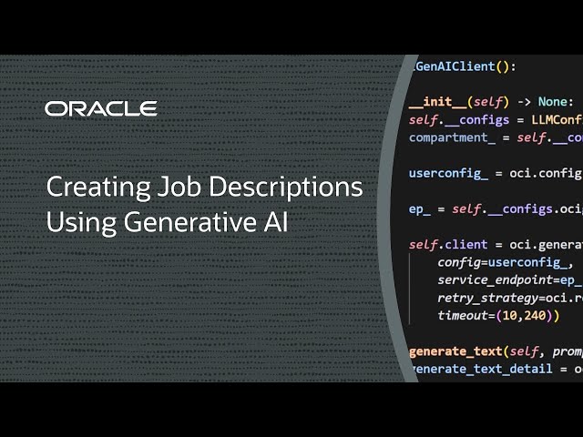 Als Recruiter oder einstellender Manager können Sie generative KI verwenden, um Hilfe beim Erstellen des ersten Entwurfs einer Tätigkeitsbeschreibung basierend auf der Berufsbezeichnung, dem Unternehmen und dem Geschäftsbereich zu erhalten. Der Entwurf könnte eine Zusammenfassung, eine Beschreibung, Zuständigkeiten und Qualifikationen enthalten. Diese Demoanwendung zeigt, wie Sie mit dem generativen KI-Service von Oracle Cloud Infrastructure (OCI) schnell eine funktionierende Anwendung erstellen können.