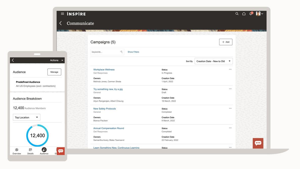 Design, track, and analyze communications to keep your workforce informed, support change, and reinforce organizational culture—all targeted and personalized based on employee data managed in Oracle Cloud HCM.