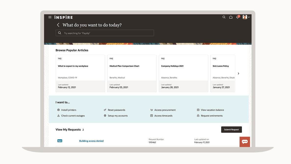 Improve employee experiences beyond HR by including actions and resources from third-party systems and other Oracle Cloud Applications, including financials, supply chain, customer experience, and more.