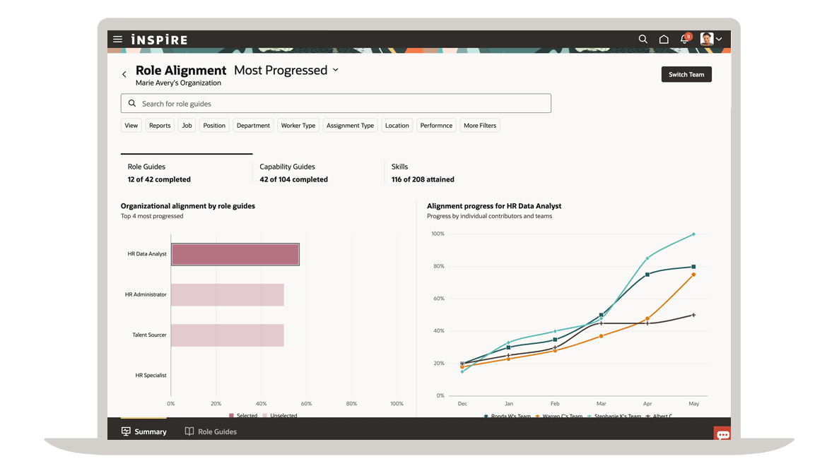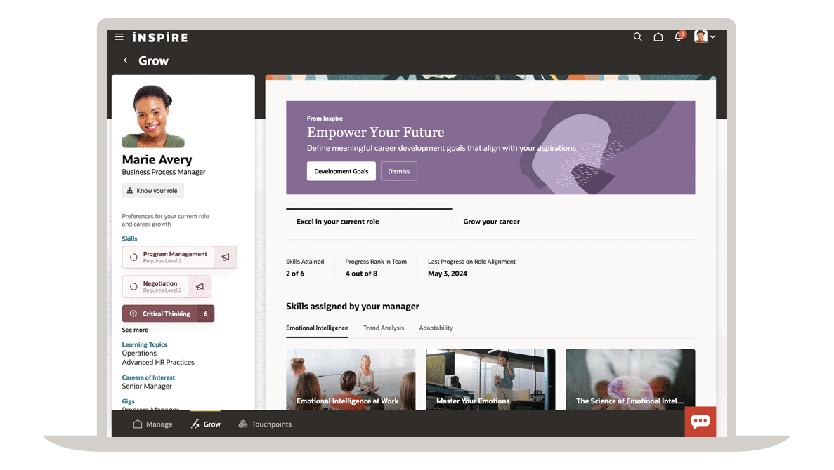 Maximize talent potential with an AI-powered growth experience that gives employees better visibility into evolving role expectations and provides transparency into the different ways they can grow in the organization.