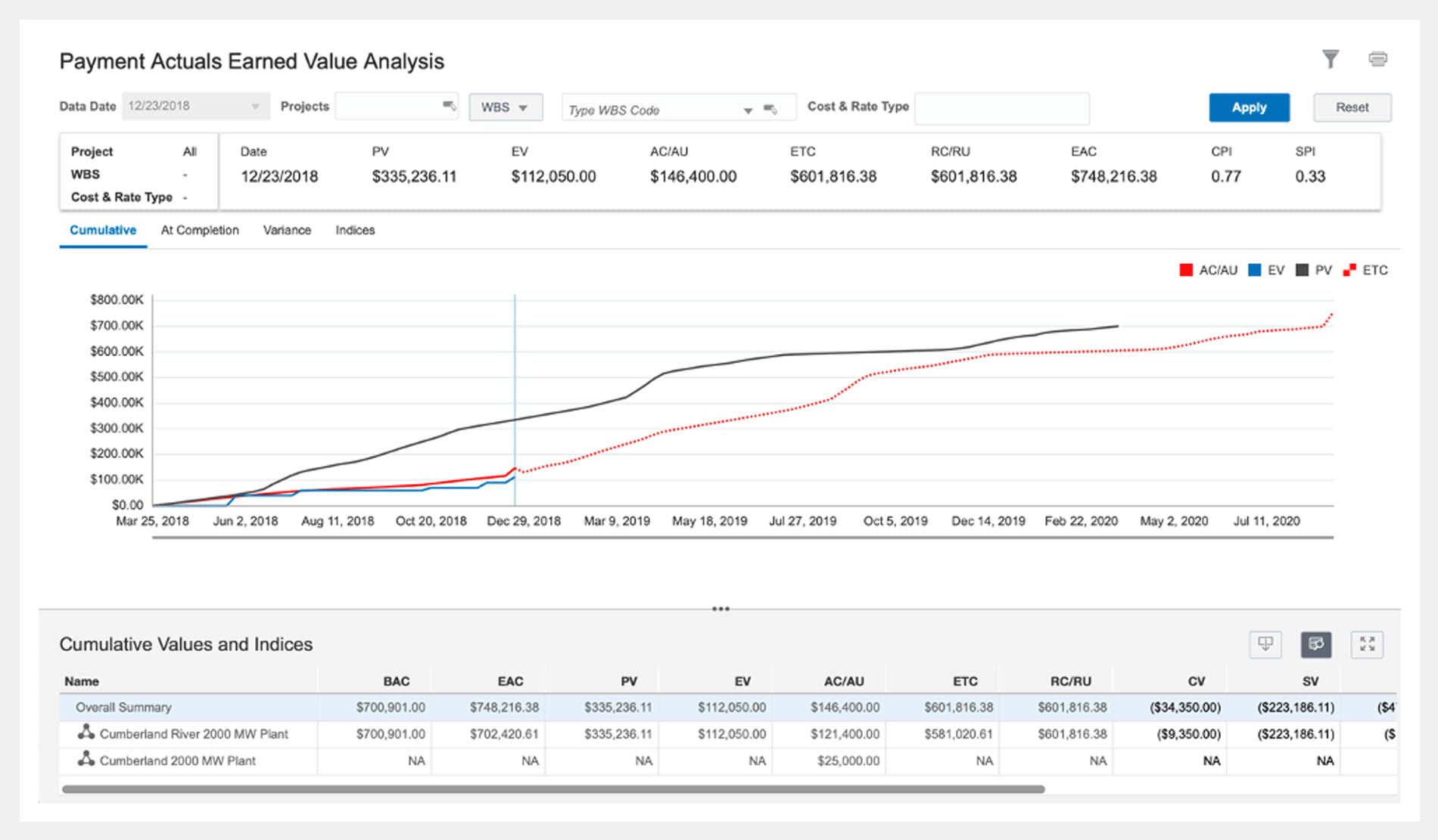 Oracle Construction and Engineering, a leader in project and portfolio management solutions, understands organizations’ perennial EVM pain points (one of Primavera’s founders literally wrote the book on EVM*). Just as important, we understand its potential to drive better project outcomes. Oracle’s EVM solution unifies cost, schedule, and plan data, and extends insight with powerful analytics capabilities. Our solution brings new levels of insight and efficiency to EVM processes.