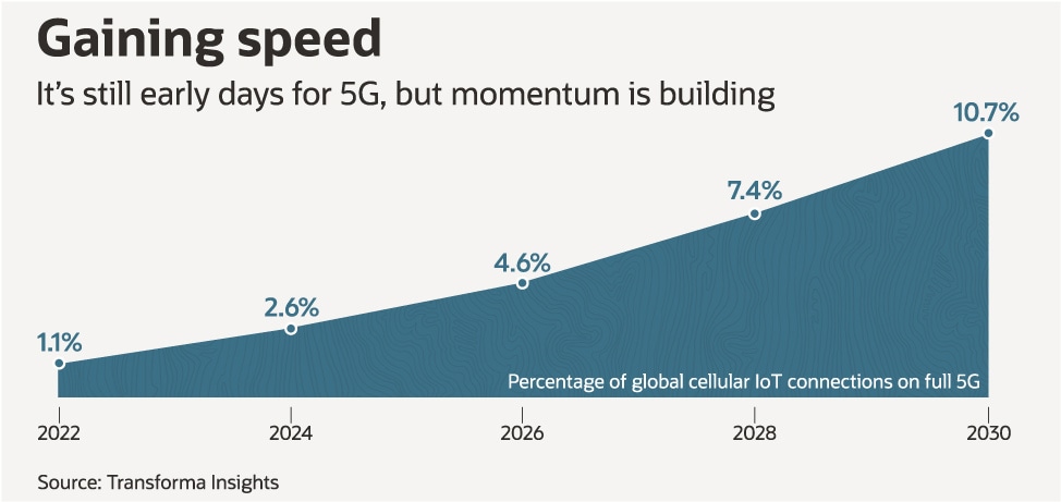 Only 21% of 1,325 global businesses surveyed by consultancy EY last November said they were currently investing in 5G, compared with 38% investing in broader Internet of Things (IoT) technologies and 65% in robotics and factory automation. Machines built to the latest standard are even rarer. Just 1.1% of cellular IoT devices ran full-fledged 5G radio technology at the end of last year, though that will rise to more than 10% by 2030, according to market researcher Transforma Insights. Just three of every 10,000 such devices run on private 5G networks that businesses build and host themselves, a number set to increase 21-fold by the beginning of the next decade.