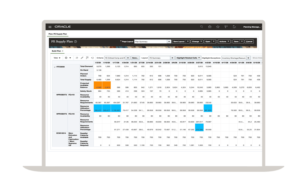 Oracle Supply Planning 能確定滿足需求所需的庫存、產能和物料供應,包括直接出貨、接單採購和合約製造項目。該解決方案還能標明可能導致需求面臨風險的需求壓縮、材料短缺和資源超載等異常情況。在選擇加速措施、擴增產能或其他干預措施時,您可以看到這些措施對財務和客戶服務的潛在影響。