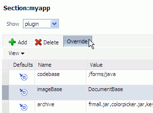 Note: If your icons are not in a JAR file, you can place them anywhere on the middle tier computer and use an absolute path mapping with a leading forward slash, such as /myicons/, for the iconpath setting. You would need to map a virtual directory called myicons to the physical directory where you have placed the icons. If you do place the icons in a subdirectory of the directory pointed to by imageBase, you can use a relative path, with no leading forward slash, such as icons/. Such a mapping would mean that the icons should be, for this example, in \forms\java\icons when imageBase is set to codebase.